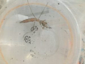 こちらは分かりにくいですがSサイズのコオロギを食している4齢のカマになります。やや餌が小さ目と言う気もしますがこれ以上になると怖がってそもそも手をつけないカマキリも出てきます。難しいですね。