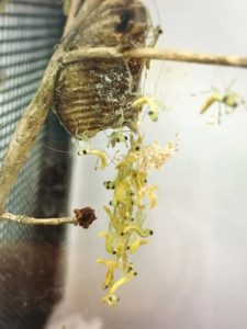 卵嚢が孵化時期になってきたら日に当て、ついでに卵嚢のついた枝やケースなどに霧吹きを多少するものですがこの霧吹きが足りなかったのかもしれません。他のカマキリも同じと言えば同じですが孵化=第一回目の脱皮を成功させる為には孵化の時期をある程度予測して適度な加湿をしっかり意識していきましょう。