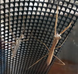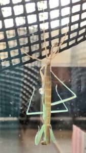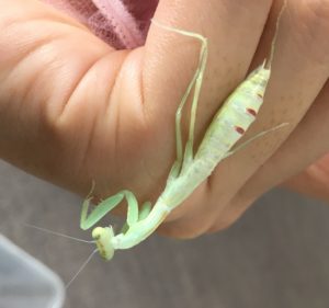 写真のハラビロカマキリは脱皮途中に脚が引っかかり抜けなくなってしまっていたので補助をしました。