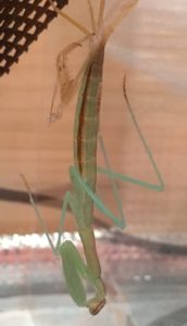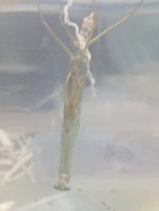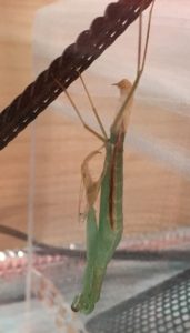 脚が抜けた時点ではカマキリの首は体の内側に折れた様な感じで曲がっていますが徐々に上(ぶら下がっているので床側)を向いて首を伸ばしていきます。それと共に触覚も一緒に上を向いていきます。脚が全て綺麗に抜けたら大体OK。首がきちんと上を向いて伸びたのなら完全な脱皮成功となります。
