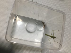 カマキリの身体測定を定期的にしている私ですが脱皮準備態勢と思われる個体がいる時は時を待ちます。そういった個体が無事脱皮を終えて丸1日程度たってカマキリ全員が活動的な時にケースから出して改めて身体測定を行っています。複数いるとタイミングがなかなか難しいのですが全体が同じ齢になったくらいが大体ねらい目となっております。