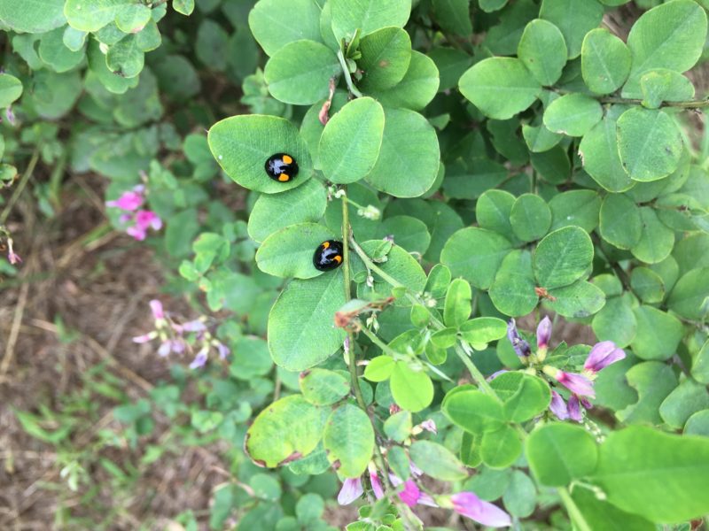 ナナホシテントウと並ぶレベルで私はよく見かけるスタンダードテントウムシと言う感じ。黒ベースに赤い星が2つのものが見慣れているけれど模様は個体によって多種多様な様子。その点慣れないと他のテントウムシとの同定は難しいのかもしれない。
